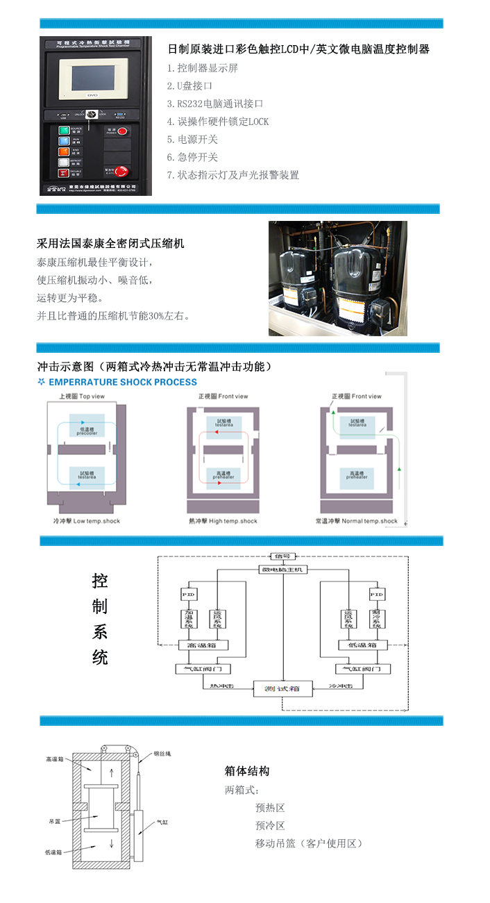 沖擊試驗(yàn)箱安全保護(hù)裝置:無(wú)熔絲超載探保護(hù),壓縮機(jī)過(guò)熱, 過(guò)流, 超壓, 加熱干燒, 箱內(nèi)超溫警報(bào)系統(tǒng).